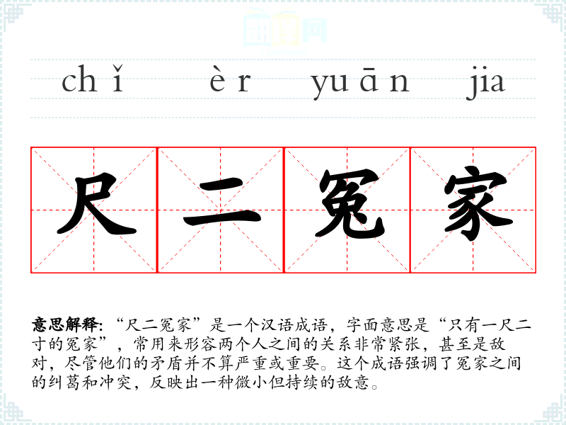 “尺二冤家”是一个汉语成语,字面意思是“只有一尺二寸的冤家”,常用来形容两个人之间的关系非常紧张,甚至是敌对,尽管他们的矛盾并不算严重或重要。这个成语强调了冤家之间的纠葛和冲突,反映出一种微小但持续的敌意。