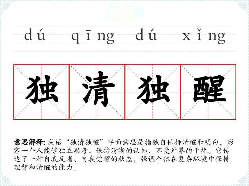 成语“独清独醒”字面意思是指独自保持清醒和明白,形容一个人能够独立思考,保持清晰的认知,不受外界的干扰。它传达了一种自我反省、自我觉醒的状态,强调个体在复杂环境中保持理智和清醒的能力。