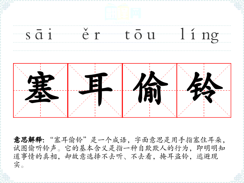 “塞耳偷铃”是一个成语,字面意思是用手指塞住耳朵,试图偷听铃声。它的基本含义是指一种自欺欺人的行为,即明明知道事情的真相,却故意选择不去听、不去看,掩耳盗铃,逃避现实。