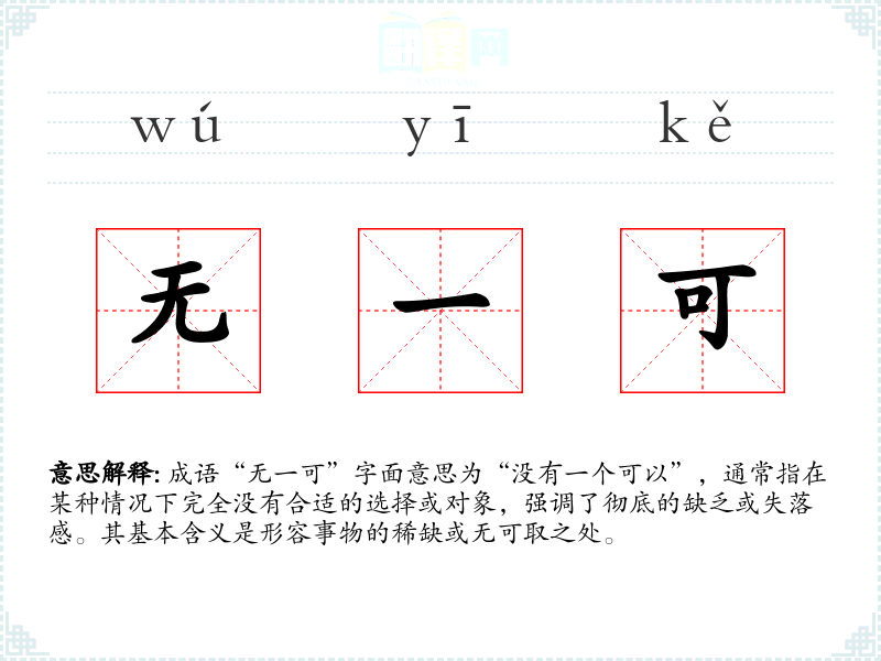 成语“无一可”字面意思为“没有一个可以”,通常指在某种情况下完全没有合适的选择或对象,强调了彻底的缺乏或失落感。其基本含义是形容事物的稀缺或无可取之处。