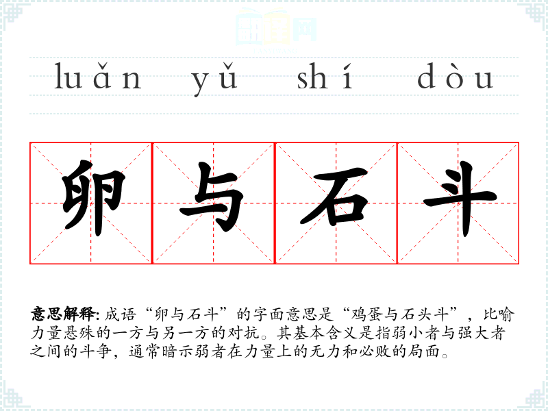 成语“卵与石斗”的字面意思是“鸡蛋与石头斗”,比喻力量悬殊的一方与另一方的对抗。其基本含义是指弱小者与强大者之间的斗争,通常暗示弱者在力量上的无力和必败的局面。