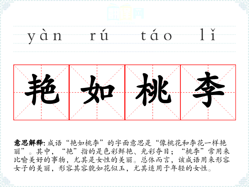 - 同义成语:如花似玉、花容月貌、貌美如花等。这些成语都用来形容女性的美丽,但“艳如桃李”更强调艳丽的色彩和青春的活力。