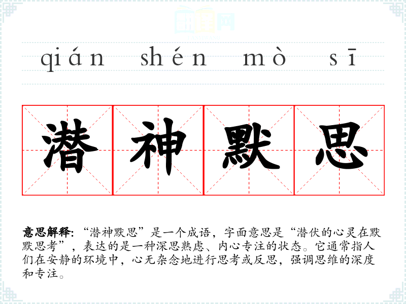 “潜神默思”是一个成语,字面意思是“潜伏的心灵在默默思考”,表达的是一种深思熟虑、内心专注的状态。它通常指人们在安静的环境中,心无杂念地进行思考或反思,强调思维的深度和专注。