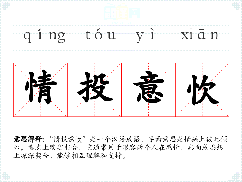 “情投意忺”是一个汉语成语,字面意思是情感上彼此倾心,意志上默契相合。它通常用于形容两个人在感情、志向或思想上深深契合,能够相互理解和支持。
