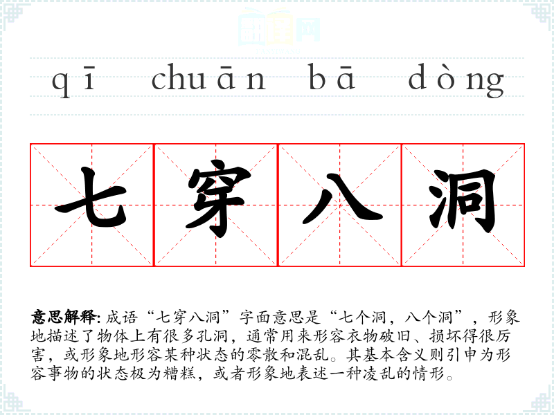 成语“七穿八洞”字面意思是“七个洞,八个洞”,形象地描述了物体上有很多孔洞,通常用来形容衣物破旧、损坏得很厉害,或形象地形容某种状态的零散和混乱。其基本含义则引申为形容事物的状态极为糟糕,或者形象地表述一种凌乱的情形。