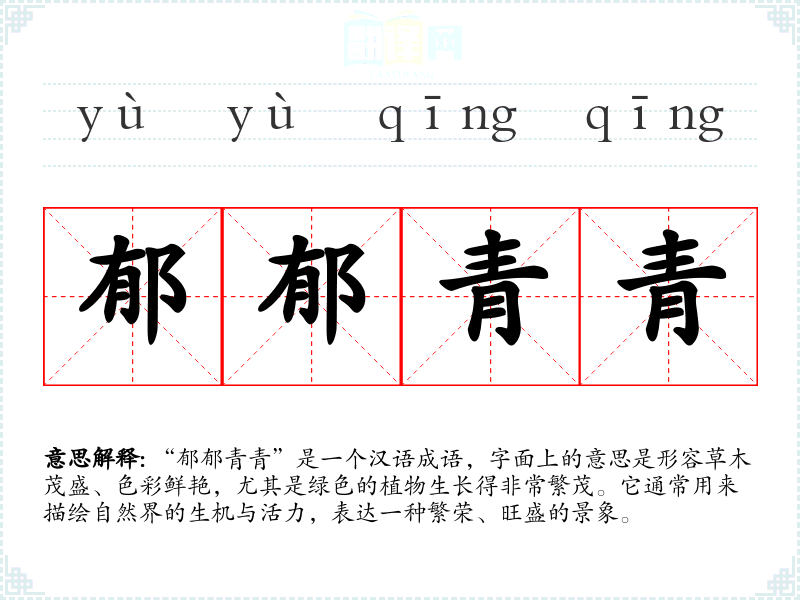 “郁郁青青”是一个汉语成语,字面上的意思是形容草木茂盛、色彩鲜艳,尤其是绿色的植物生长得非常繁茂。它通常用来描绘自然界的生机与活力,表达一种繁荣、旺盛的景象。