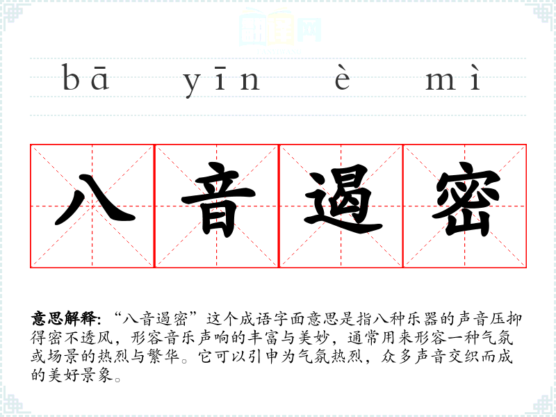 “八音遏密”这个成语字面意思是指八种乐器的声音压抑得密不透风,形容音乐声响的丰富与美妙,通常用来形容一种气氛或场景的热烈与繁华。它可以引申为气氛热烈,众多声音交织而成的美好景象。