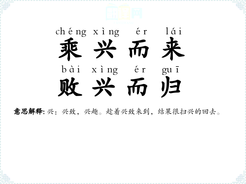 乘:趁,因;兴:兴致,兴趣。趁着兴致来到,结果很扫兴的回去。 |