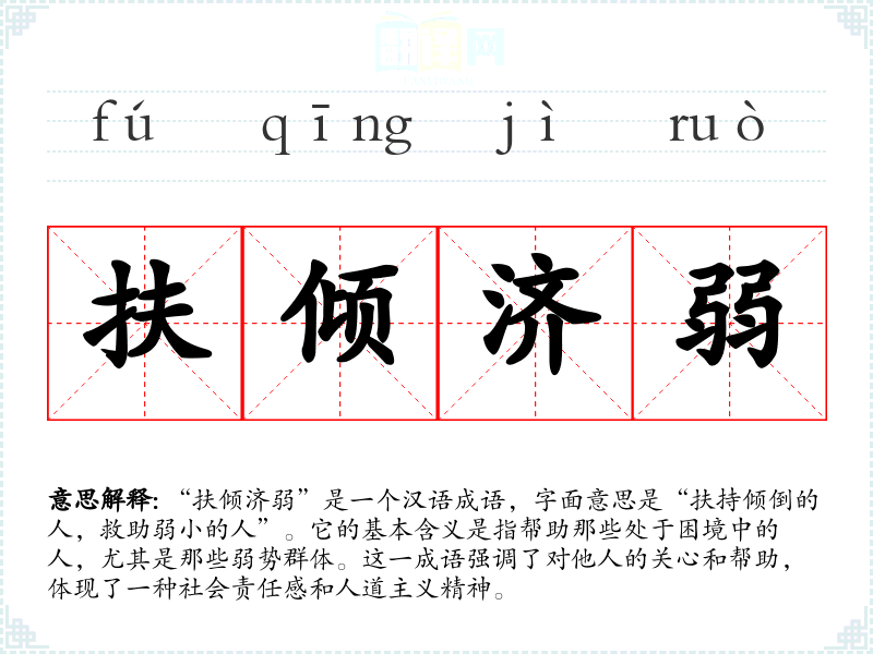 | 扶倾济弱 | 倾:倒塌,这里指遇到困境的人。扶助困难的人,救济弱小的人。 |