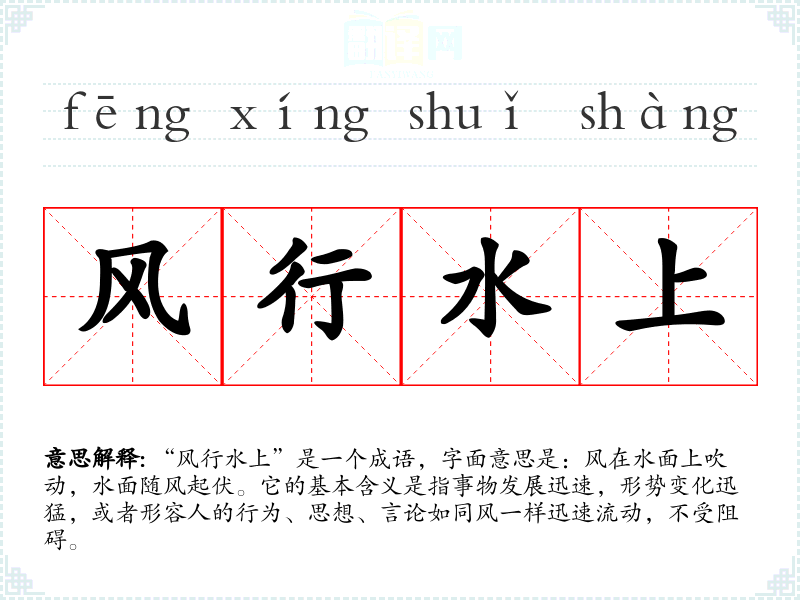 “风行水上”是一个成语,字面意思是:风在水面上吹动,水面随风起伏。它的基本含义是指事物发展迅速,形势变化迅猛,或者形容人的行为、思想、言论如同风一样迅速流动,不受阻碍。