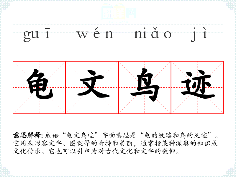 成语“龟文鸟迹”字面意思是“龟的纹路和鸟的足迹”。它用来形容文字、图案等的奇特和美丽,通常指某种深奥的知识或文化传承。它也可以引申为对古代文化和文字的敬仰。