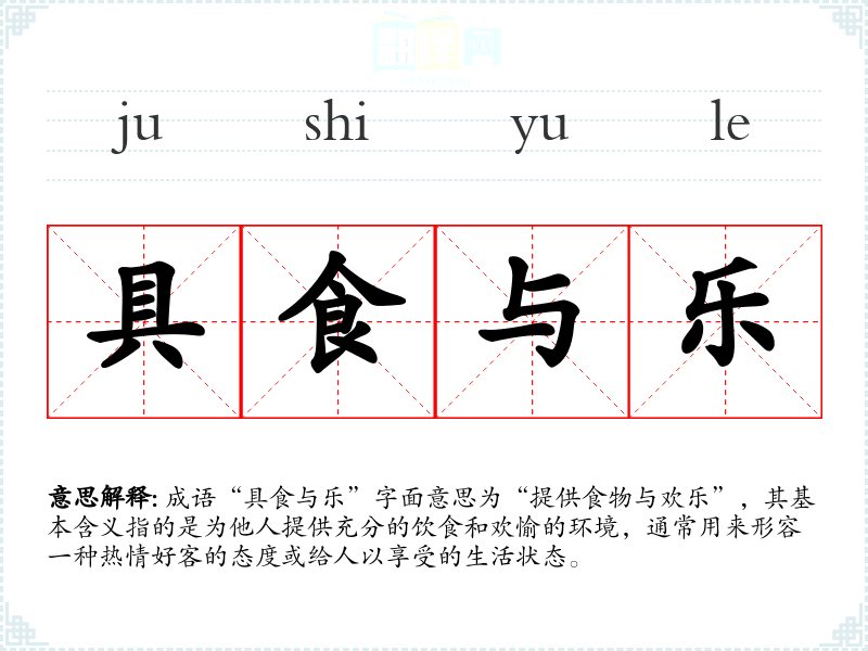 成语“具食与乐”字面意思为“提供食物与欢乐”,其基本含义指的是为他人提供充分的饮食和欢愉的环境,通常用来形容一种热情好客的态度或给人以享受的生活状态。