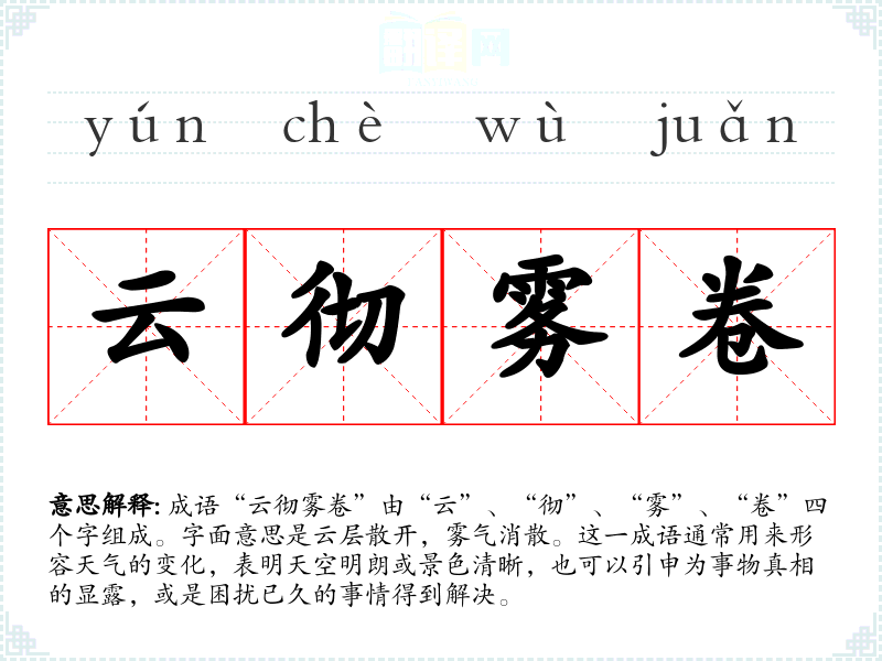 成语“云彻雾卷”由“云”、“彻”、“雾”、“卷”四个字组成。字面意思是云层散开,雾气消散。这一成语通常用来形容天气的变化,表明天空明朗或景色清晰,也可以引申为事物真相的显露,或是困扰已久的事情得到解决。