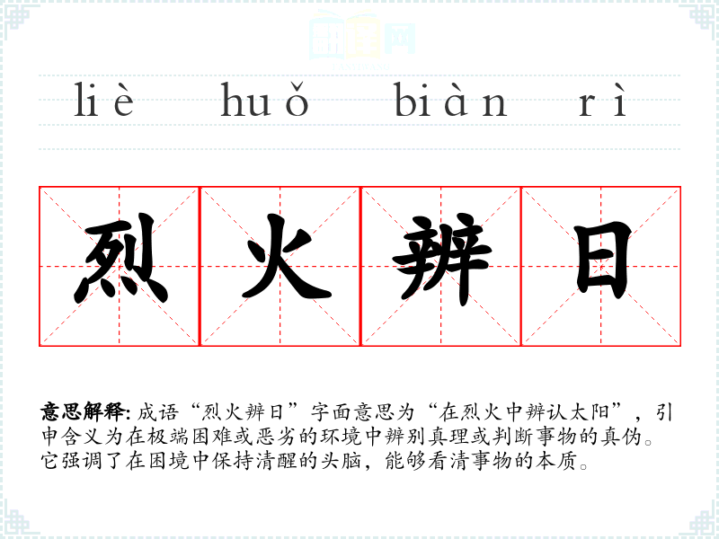 成语“烈火辨日”字面意思为“在烈火中辨认太阳”,引申含义为在极端困难或恶劣的环境中辨别真理或判断事物的真伪。它强调了在困境中保持清醒的头脑,能够看清事物的本质。