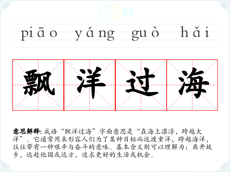 成语“飘洋过海”字面意思是“在海上漂浮,跨越大洋”。它通常用来形容人们为了某种目标而远渡重洋,跨越海洋,往往带有一种艰辛与奋斗的意味。基本含义则可以理解为:离开故乡,远赴他国或远方,追求更好的生活或机会。