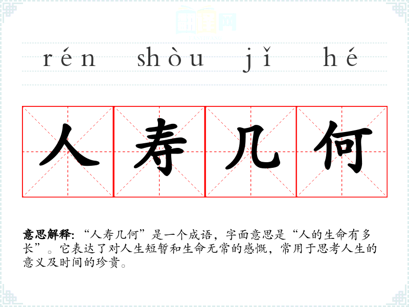 “人寿几何”是一个成语,字面意思是“人的生命有多长”。它表达了对人生短暂和生命无常的感慨,常用于思考人生的意义及时间的珍贵。