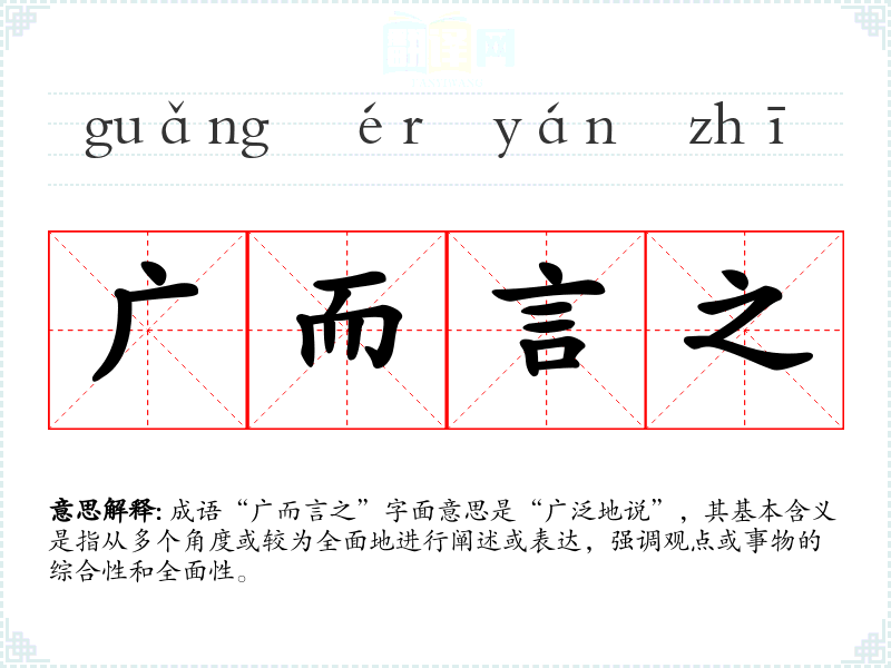 成语“广而言之”字面意思是“广泛地说”,其基本含义是指从多个角度或较为全面地进行阐述或表达,强调观点或事物的综合性和全面性。