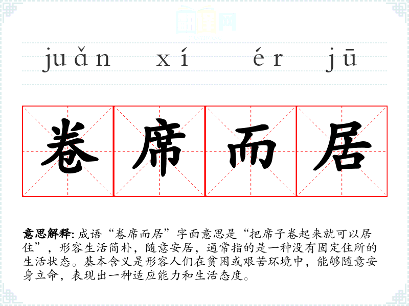 成语“卷席而居”字面意思是“把席子卷起来就可以居住”,形容生活简朴,随意安居,通常指的是一种没有固定住所的生活状态。基本含义是形容人们在贫困或艰苦环境中,能够随意安身立命,表现出一种适应能力和生活态度。