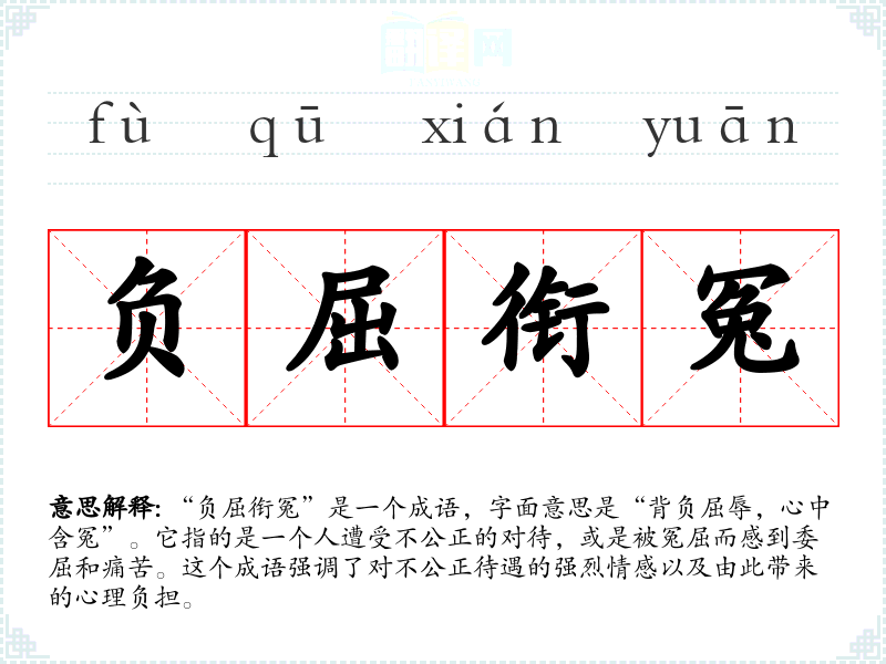 “负屈衔冤”是一个成语,字面意思是“背负屈辱,心中含冤”。它指的是一个人遭受不公正的对待,或是被冤屈而感到委屈和痛苦。这个成语强调了对不公正待遇的强烈情感以及由此带来的心理负担。
