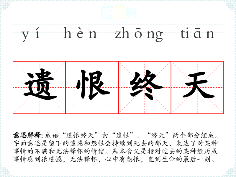 成语“遗恨终天”由“遗恨”、“终天”两个部分组成。字面意思是留下的遗憾和怨恨会持续到死去的那天,表达了对某种事情的不满和无法释怀的情绪。基本含义是指对过去的某种经历或事情感到很遗憾,无法释怀,心中有怨恨,直到生命的最后一刻。