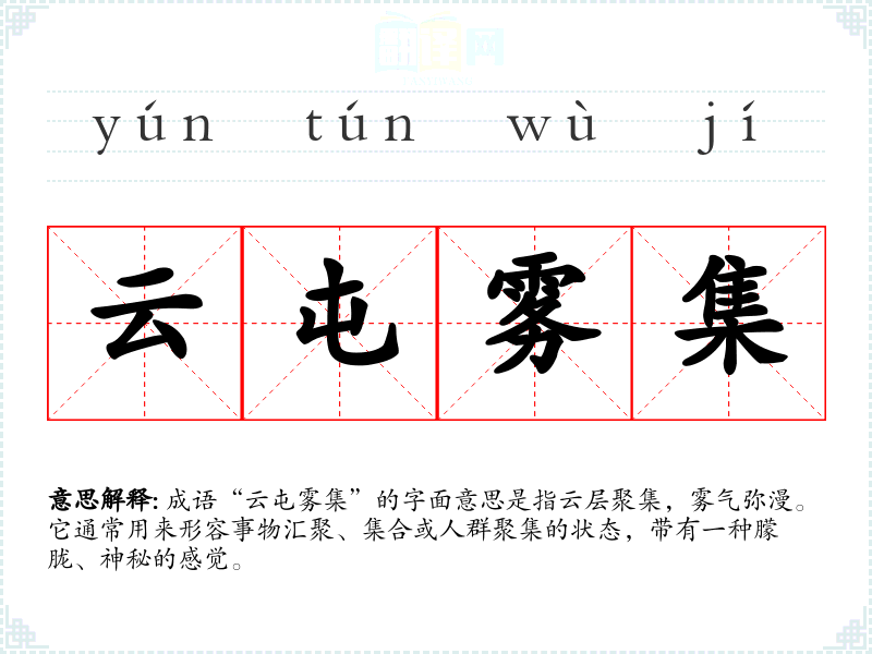 成语“云屯雾集”的字面意思是指云层聚集,雾气弥漫。它通常用来形容事物汇聚、集合或人群聚集的状态,带有一种朦胧、神秘的感觉。