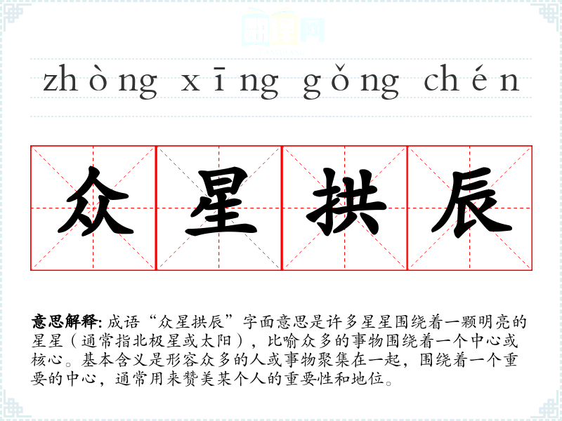 | 众星拱辰 | 拱:环绕,拱卫;辰:指北极星。天上众星拱卫北辰。旧指有德的国君在位,得到天下臣民的拥戴。后也比喻四方归向一处。 |