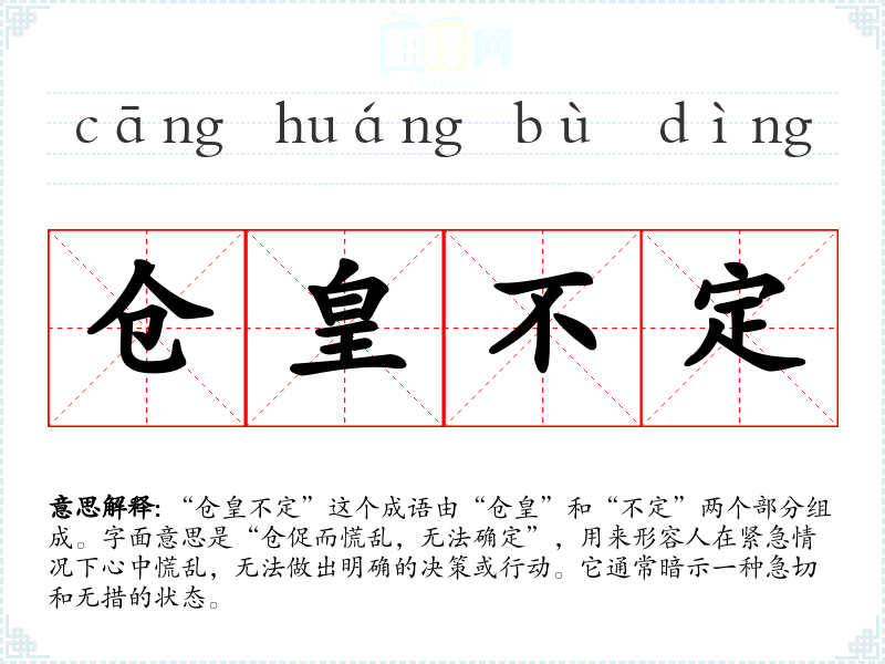 “仓皇不定”这个成语由“仓皇”和“不定”两个部分组成。字面意思是“仓促而慌乱,无法确定”,用来形容人在紧急情况下心中慌乱,无法做出明确的决策或行动。它通常暗示一种急切和无措的状态。