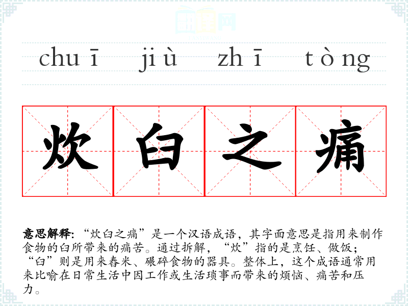 “炊臼之痛”是一个汉语成语,其字面意思是指用来制作食物的臼所带来的痛苦。通过拆解,“炊”指的是烹饪、做饭;“臼”则是用来舂米、碾碎食物的器具。整体上,这个成语通常用来比喻在日常生活中因工作或生活琐事而带来的烦恼、痛苦和压力。