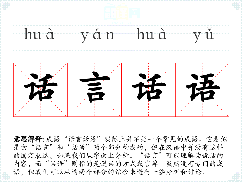 由于“话言话语”并不为传统成语,因此没有具体的历史背景或典故来源。我们可以借助汉语中与“话”相关的成语进行联想,比如“言之成理”、“言简意赅”等。
