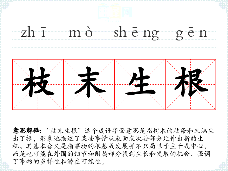 “枝末生根”出自于《庄子·齐物论》,原文为“枝末生根,根生枝末”,意指事物的生长并非单一的方式,常常会在意想不到的地方找到生命力。这一成语反映了庄子哲学中对自然和事物本质的深刻理解,强调了事物内部的关联与变化。