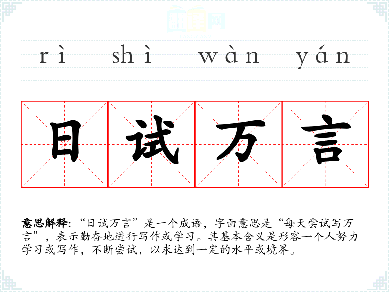 “日试万言”是一个成语,字面意思是“每天尝试写万言”,表示勤奋地进行写作或学。其基本含义是形容一个人努力学或写作,不断尝试,以求达到一定的水平或境界。