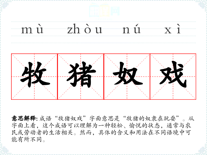 成语“牧猪奴戏”字面意思是“牧猪的奴隶在玩耍”。从字面上看,这个成语可以理解为一种轻松、愉悦的状态,通常与农民或劳动者的生活相关。然而,具体的含义和用法在不同语境中可能有所不同。