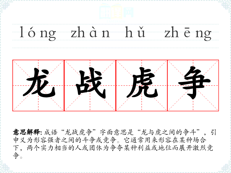 成语“龙战虎争”字面意思是“龙与虎之间的争斗”,引申义为形容强者之间的斗争或竞争。它通常用来形容在某种场合下,两个实力相当的人或团体为争夺某种利益或地位而展开激烈竞争。