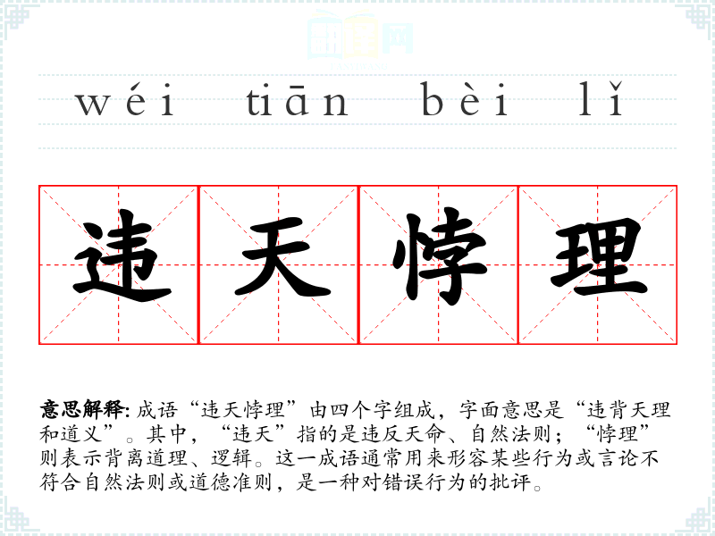 成语“违天悖理”由四个字组成,字面意思是“违背天理和道义”。其中,“违天”指的是违反天命、自然法则;“悖理”则表示背离道理、逻辑。这一成语通常用来形容某些行为或言论不符合自然法则或道德准则,是一种对错误行为的批评。
