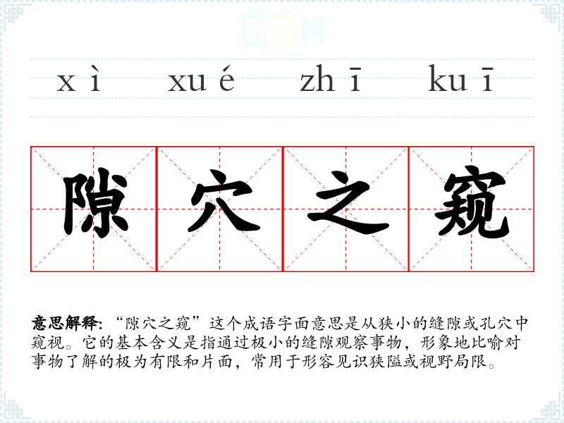 通过对“隙穴之窥”的学,我深刻认识到在日常生活和学中全面理解的重要性。这个成语不仅丰富了我的语言表达,也提醒我在面对问题时要保持开放的心态,努力从多个角度去看待事物,以免陷入片面的理解。