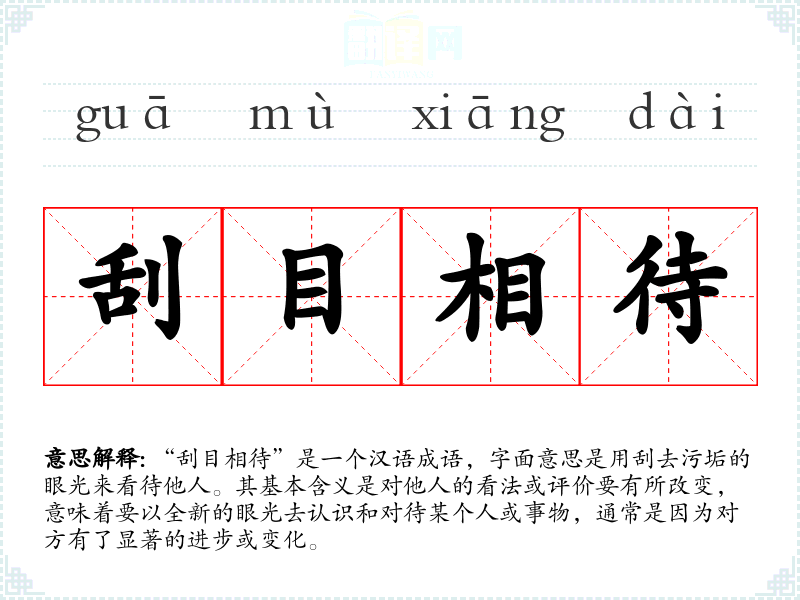 “刮目相待”是一个汉语成语,字面意思是用刮去污垢的眼光来看待他人。其基本含义是对他人的看法或评价要有所改变,意味着要以全新的眼光去认识和对待某个人或事物,通常是因为对方有了显著的进步或变化。