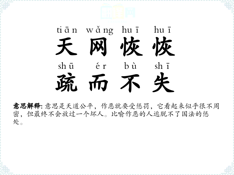 意思是天道公平,作恶就要受惩罚,它看起来似乎很不周密,但最终不会放过一个坏人。比喻作恶的人逃脱不了国法的惩处。 |