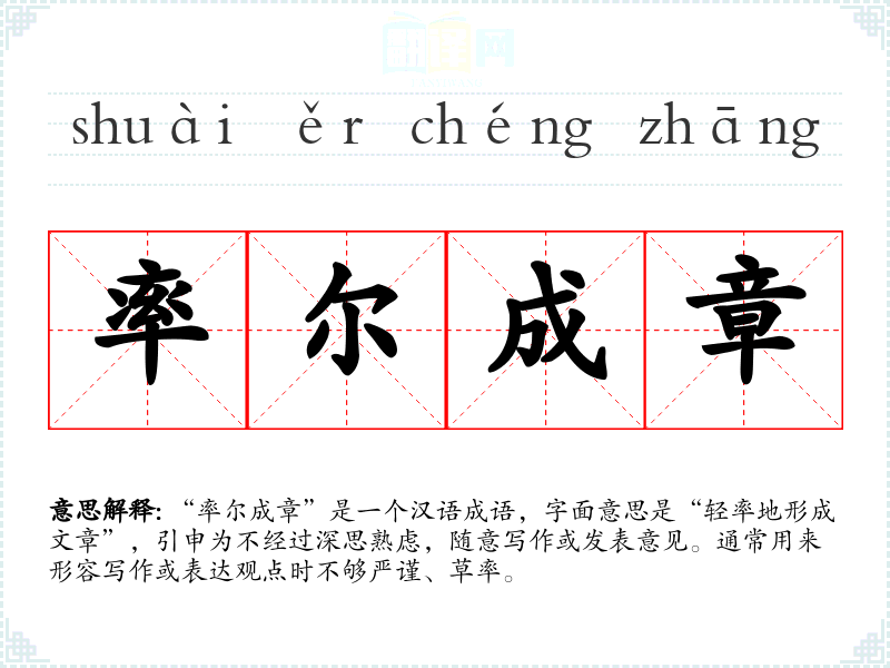 | 率尔成章 | 率尔:不经思索,随意地。不加思索,下笔成文。形容写文章粗疏草率,不认真。 |