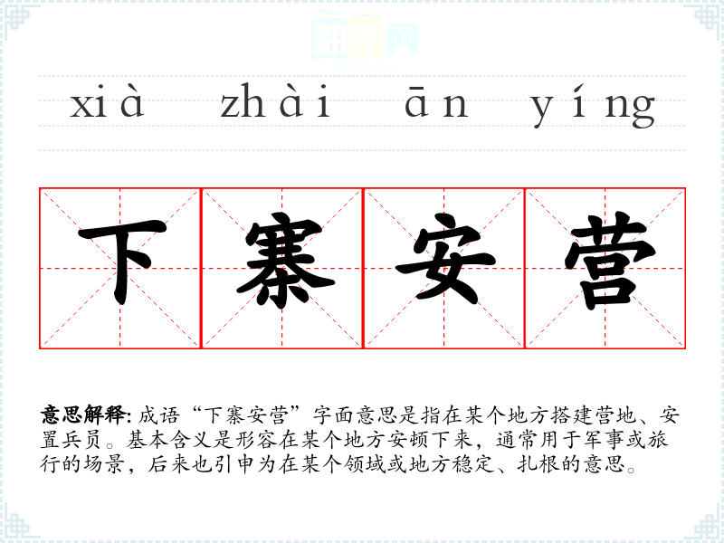成语“下寨安营”字面意思是指在某个地方搭建营地、安置兵员。基本含义是形容在某个地方安顿下来,通常用于军事或旅行的场景,后来也引申为在某个领域或地方稳定、扎根的意思。