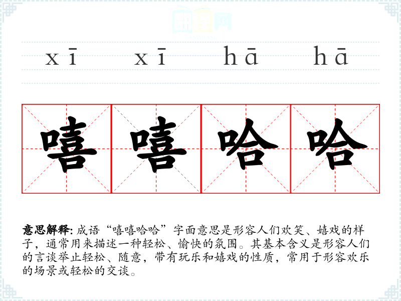 成语“嘻嘻哈哈”字面意思是形容人们欢笑、嬉戏的样子,通常用来描述一种轻松、愉快的氛围。其基本含义是形容人们的言谈举止轻松、随意,带有玩乐和嬉戏的性质,常用于形容欢乐的场景或轻松的交谈。