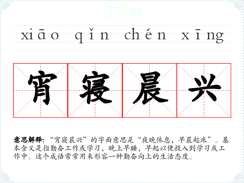 “宵寝晨兴”的字面意思是“夜晚休息,早晨起床”。基本含义是指勤奋工作或学,晚上早睡,早起以便投入到学或工作中。这个成语常常用来形容一种勤奋向上的生活态度。