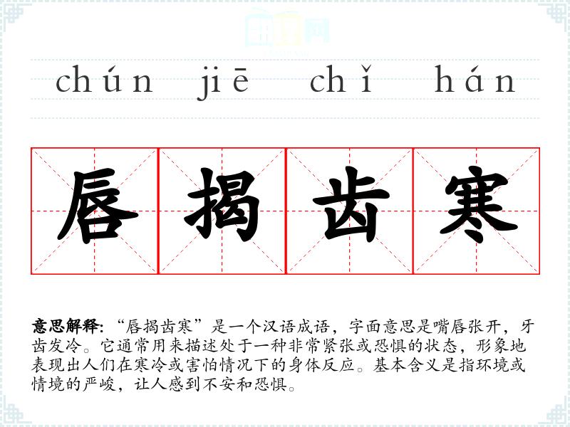 “唇揭齿寒”是一个汉语成语,字面意思是嘴唇张开,牙齿发冷。它通常用来描述处于一种非常紧张或恐惧的状态,形象地表现出人们在寒冷或害怕情况下的身体反应。基本含义是指环境或情境的严峻,让人感到不安和恐惧。