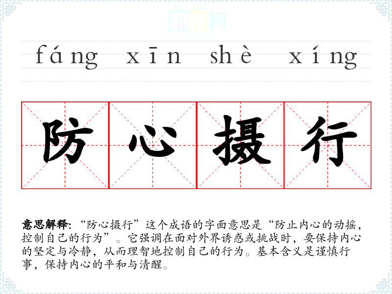 “防心摄行”这个成语的字面意思是“防止内心的动摇,控制自己的行为”。它强调在面对外界诱惑或挑战时,要保持内心的坚定与冷静,从而理智地控制自己的行为。基本含义是谨慎行事,保持内心的平和与清醒。