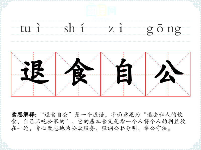 “退食自公”是一个成语,字面意思为“退去私人的饮食,自己只吃公家的”。它的基本含义是指一个人将个人的利益放在一边,专心致志地为公众服务,强调公私分明,奉公守法。