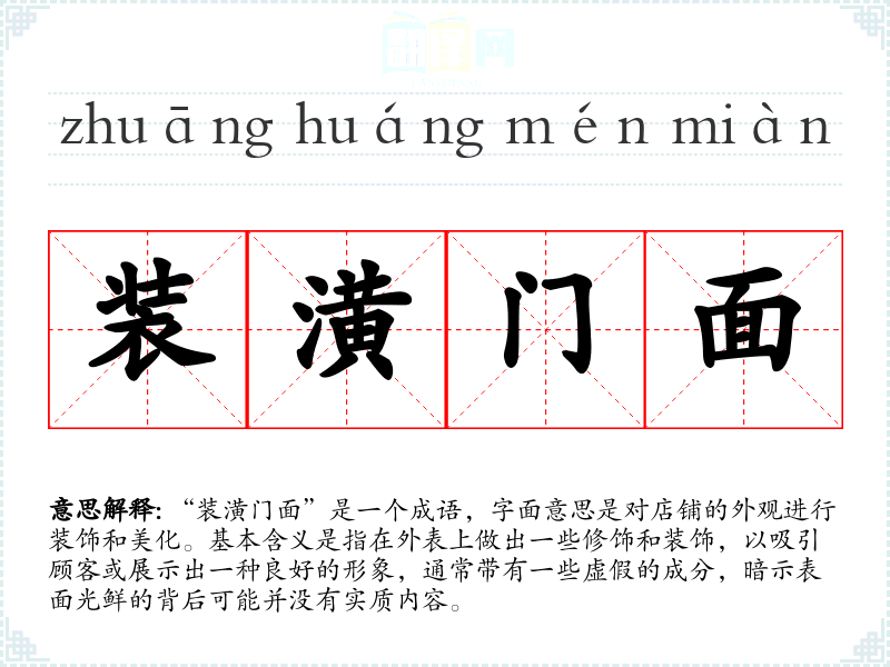 “装潢门面”是一个成语,字面意思是对店铺的外观进行装饰和美化。基本含义是指在外表上做出一些修饰和装饰,以吸引顾客或展示出一种良好的形象,通常带有一些虚假的成分,暗示表面光鲜的背后可能并没有实质内容。