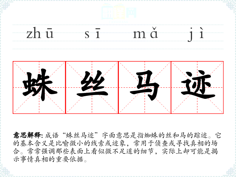 成语“蛛丝马迹”字面意思是指蜘蛛的丝和马的踪迹。它的基本含义是比喻微小的线索或迹象,常用于侦查或寻找真相的场合。常常强调那些表面上看似微不足道的细节,实际上却可能是揭示事情真相的重要依据。
