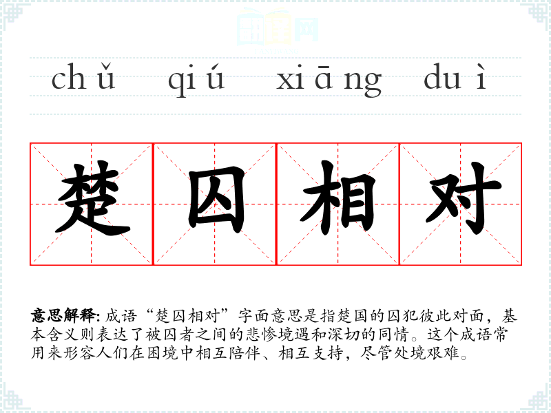 成语“楚囚相对”字面意思是指楚国的囚犯彼此对面,基本含义则表达了被囚者之间的悲惨境遇和深切的同情。这个成语常用来形容人们在困境中相互陪伴、相互支持,尽管处境艰难。