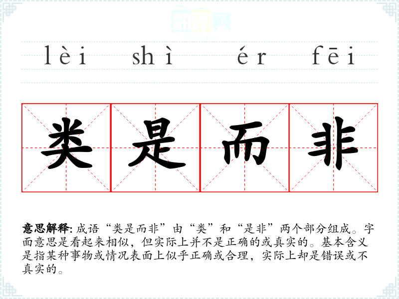 成语“类是而非”由“类”和“是非”两个部分组成。字面意思是看起来相似,但实际上并不是正确的或真实的。基本含义是指某种事物或情况表面上似乎正确或合理,实际上却是错误或不真实的。
