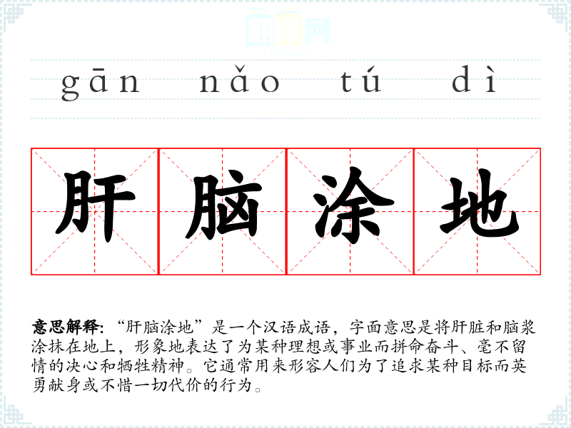 在英语中,类似的表达可以是 "to go above and beyond" 或 "to lay down one's life for a cause"。这些表达同样强调了为理想、事业或他人不惜一切代价的精神,但可能不具备“肝脑涂地”那种强烈的视觉冲击和生动形象。