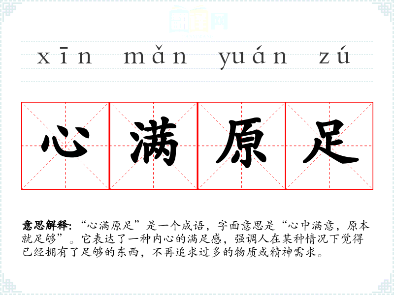 “心满原足”是一个成语,字面意思是“心中满意,原本就足够”。它表达了一种内心的满足感,强调人在某种情况下觉得已经拥有了足够的东西,不再追求过多的物质或精神需求。